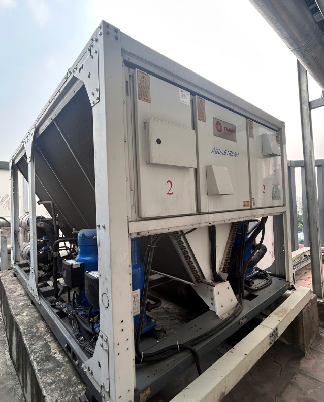 Đối với nhóm hệ thống tiêu thụ năng lượng lớn nhất, điều hòa trung tâm tại hai tòa nội trú C2 và C3 - Bệnh viện Đa khoa Tâm Anh TP. Hồ Chí Minh sử dụng hệ thống chiller giải nhiệt gió của hãng Trane với chỉ số hiệu suất COP đạt 3,079 được thiết kế để đáp ứng các khu vực có yêu cầu cao như phòng mổ, hồi sức tích cực và các không gian điều trị. Hệ thống này được tích hợp vào hệ thống quản lý tòa nhà BMS, cho phép theo dõi tải và trạng thái vận hành theo thời gian thực, qua đó điều chỉnh công suất làm lạnh phù hợp với nhu cầu sử dụng thực tế.